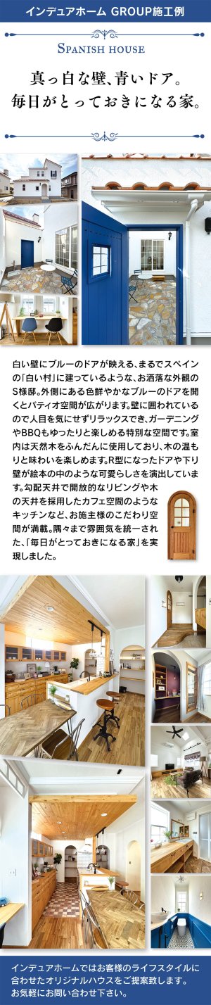 白い壁とブルーのドアが映える、スペインの白い村を思わせるS様邸。人目を気にせず過ごせるパティオや、天然木の温もりあふれる室内で、毎日がとっておきになる住まいを実現しました。